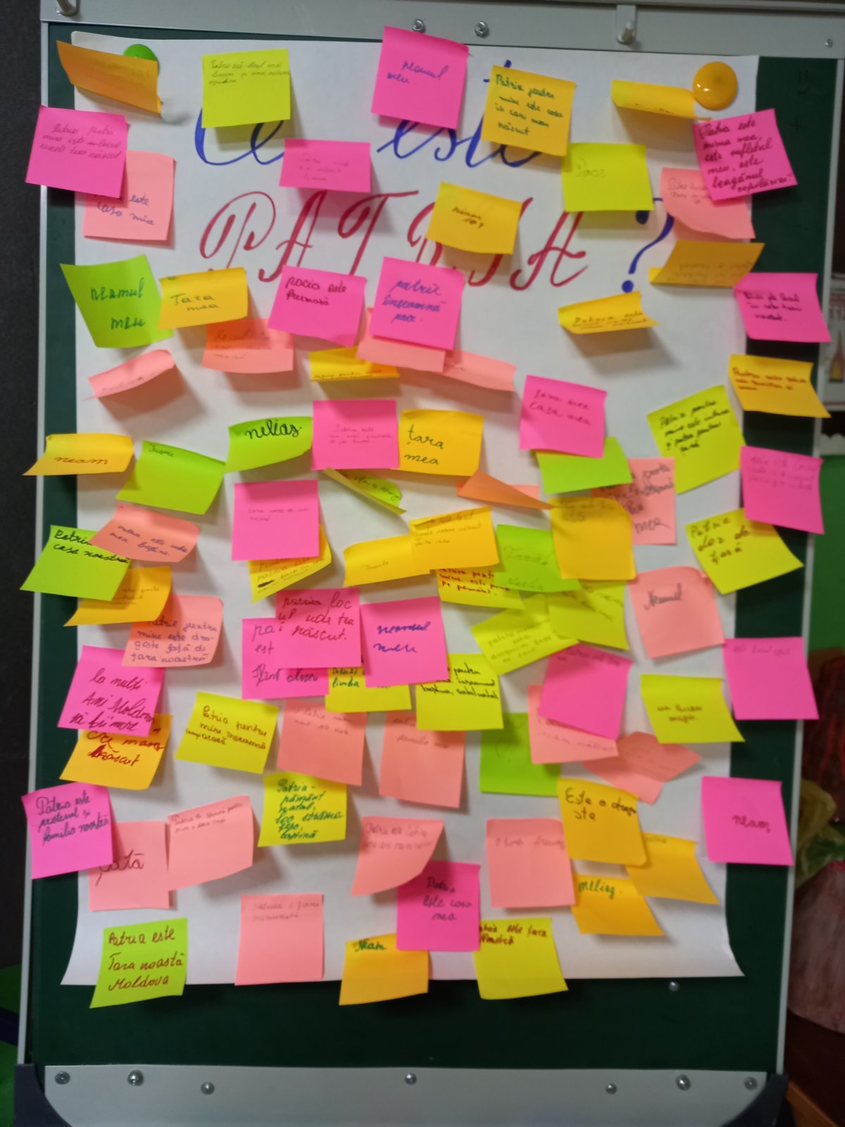 Iată câteva crâmpee din opiniile copiilor: Patria este familia, neamul; locul unde m-am născut; graiul; este inima mea, este sufletul meu; este leagănul copilăriei; țara mea; este țara în care m-am născut și trebuie să o prețuiesc; baștina; satul natal; pământ natal, loc strămoșesc; patria este parte din sufletul nostru; etc.