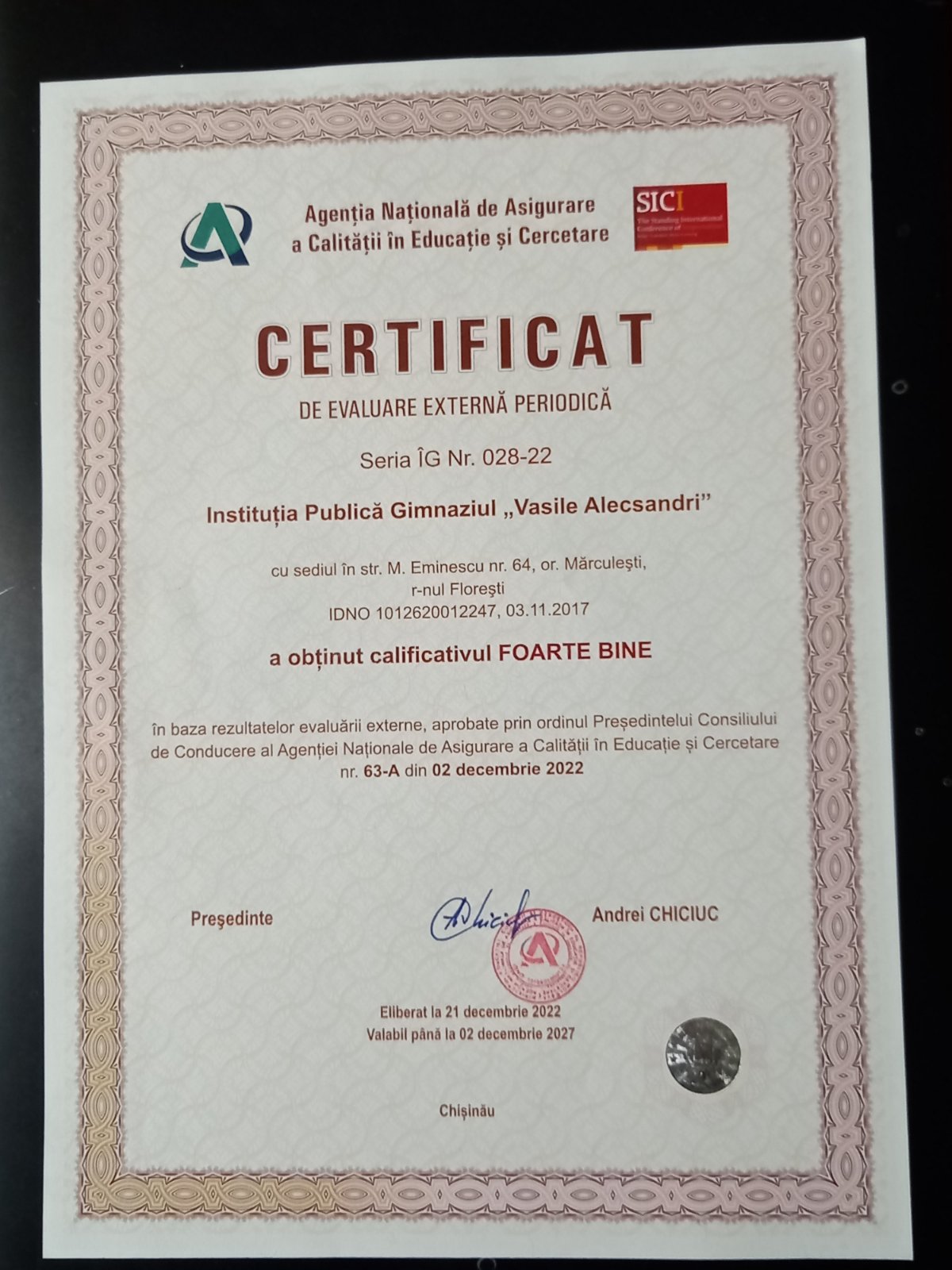 Suntem mândri pentru rezultatul evaluării, instituția fiind apreciată cu calificativul Foarte Bine!