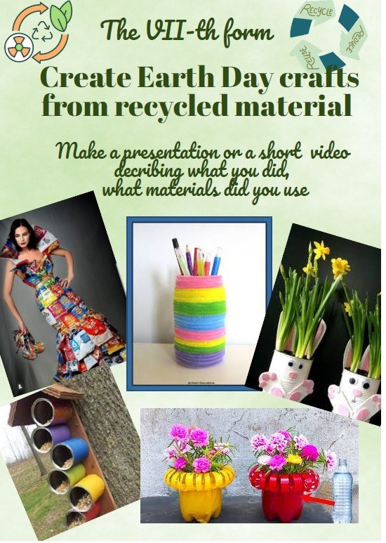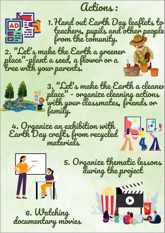 Pe parcursul a 2 luni au fost desfășurate diverse activități care au avut drept scop să atragă atenţia elevilor asupra degradării mediului înconjurător, asupra efectelor poluării şi să îi inițieze cu privire la acţiunile pe care fiecare dintre noi le poate întreprinde pentru a ajuta la conservarea naturii. Iar pe data de 22 aprilie fiecare clasă a prezentat produsele elaborate în cadrul proiectului: